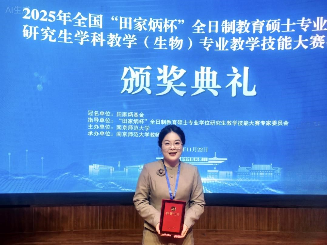 11月21日至23日,2025年全国“田家炳杯”全日制教育硕士专业学位研究生学科教学(生物)专业教学技能大赛决赛在南京师范大学举行。m882023级学科教学(生物)研究生潘雪萍荣获大赛三等奖。